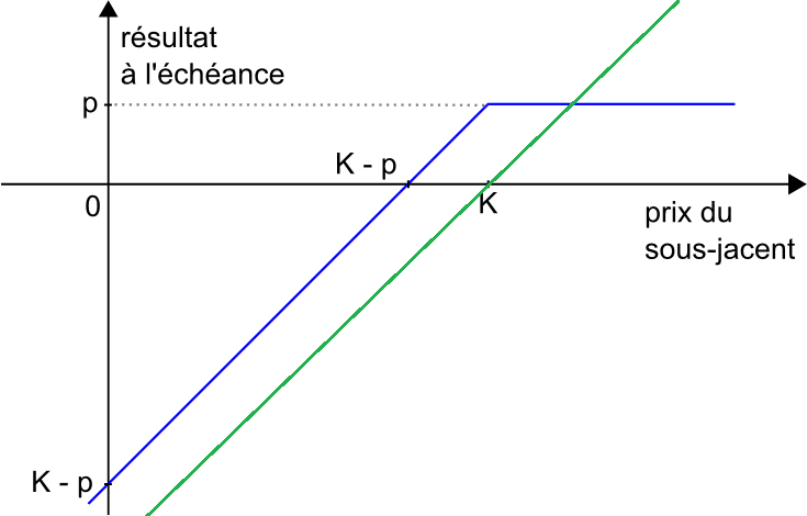 Si l’action reste au-dessus de K, votre gain ne peut pas être supérieur à p (ceci est matérialisé par la ligne horizontale bleue au niveau « p »).