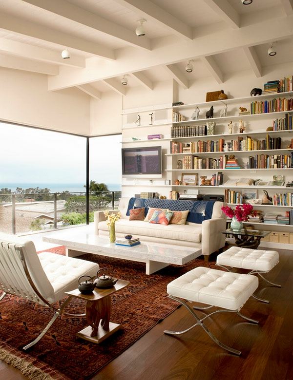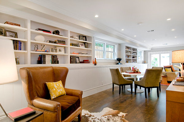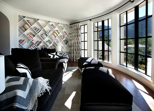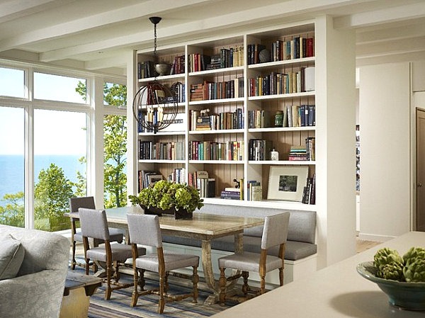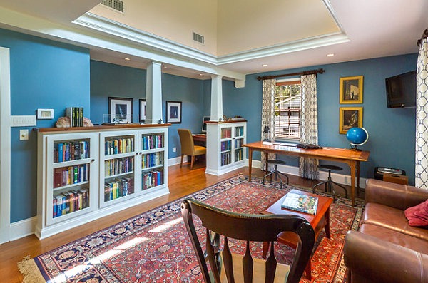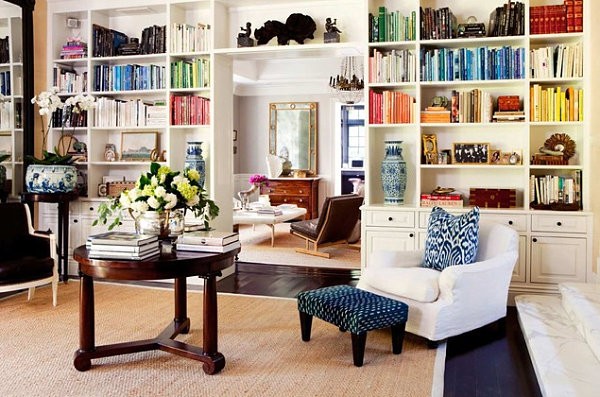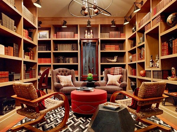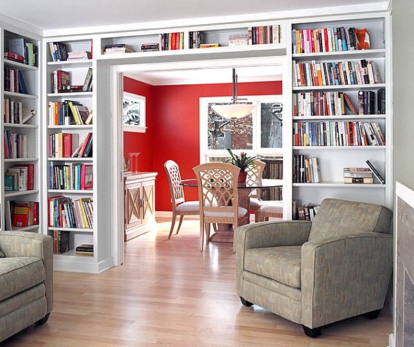 Si vous n’êtes pas fan de la bibliothèque élégante et simple, optez pour des couleurs vives. Vous pouvez peindre les étagères (comme la solution LDA Architecture & Interiors ci-dessus) ou y installer des objets colorés pour réveiller la décoration. Vous pouvez également choisir des nuances plus claires telles que le gris et le bleu. Bien que neutres, ils apporteront une touche spéciale à votre bibliothèque. Si la pièce est de domination blanche, osez par exemple le rouge (proposition de Harold « Bud » Dietrich AIA NCARB).