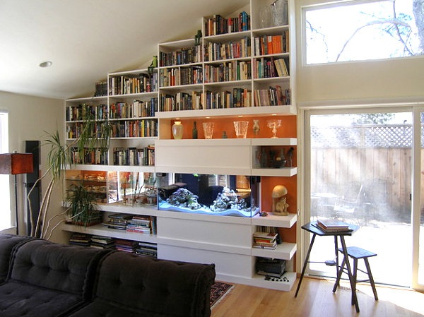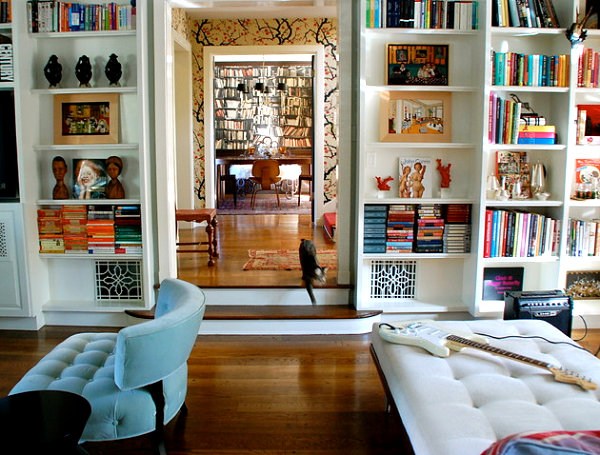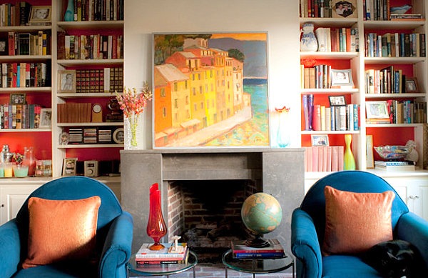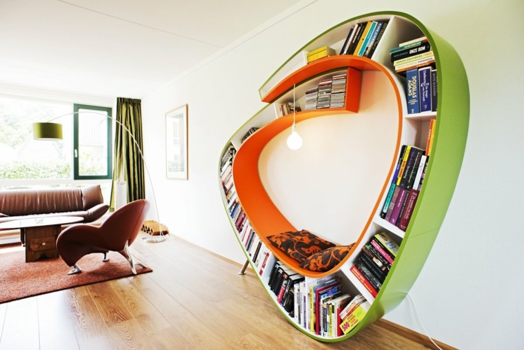Décoration de bibliothèque originale et colorée dans le salon