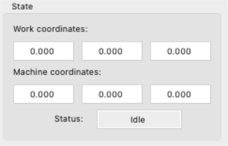 État de la machine : — Non connecté : CNC n’est pas reconnu.— Idle : En attente de la commande G-code .— Exécuter : commande G-code en cours. — Accueil : cycle d’accueil en cours. — Vérification : commande Gcode « Mode de contrôle » activé.— Maintenez : Machine suspendue par la commande » ; ! » Doit être redémarré par un commande « ~ » .— Alarme : Il y a eu une erreur, toutes les commandes Gcode sont bloquées.— Porte : Capteur de porte activé.