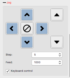 Cette partie vous permet de déplacer la broche. La croix vous permet de vous déplacer en X et Y. Le bouton central arrête le mouvement actuel. Les flèches ont le droit de se déplacer en Z.