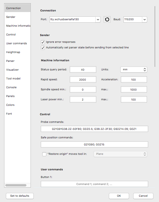 Contrôle : — Commande de sonde : une fois votre sonde z branchée, entrez « G91G21G38.2Z-50F100 ; G92 Z14.09 ; G0Z5M30″ pour utiliser le bouton Z-sonde. Remplacez « 14.09″ par la hauteur exacte de votre sonde z,— Commande Position sûre : Pour que le cnc retourne automatiquement à sa position 0 en cliquant sur le bouton de position de sécurité, entrez « G53G00G90Z0. ; G53G90X0.Y0.