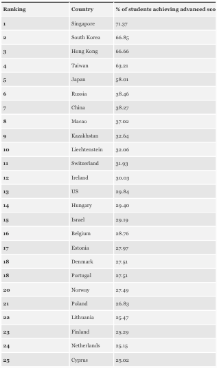 Aucune surprise étant donné le classement QI, mais l’Asie prend les cinq premières places pour les élèves ayant une note élevée à l’école. La Russie a remporté la médaille en dehors des pays asiatiques et est arrivée à la sixième place, tandis que lesÉtats-Unis se classaient treizième. Le Royaume-Uni ne figure pas sur la liste. D’autre part, il est surpris que le Kazakhstan se classe neuvième.