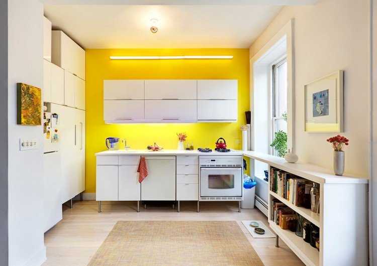 A cuisine en bois blanchi avec un mur peint en jaune pop pour un look chic et élégant