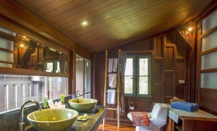 Le sol, le mur et les meubles en teck tout look dans une salle de bain avec un esprit asiatique