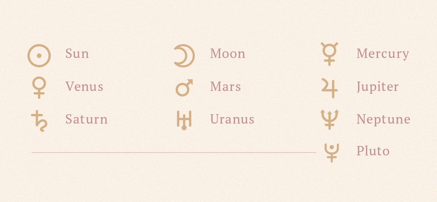 Les cartes natales incluent les emplacements planétaires, qui est l’endroit où se trouvait une planète donnée lorsque vous êtes né, en fonction de votre situation géographique. Les planètes sont représentées sur les cartes natales par des glyphes, et bien que des versions alternatives desdits glyphes existent, la représentation ci-dessous est généralement la façon dont vous pouvez vous attendre à ce qu’elles apparaissent. La signification principale pour ces planètes et leur placement est qu’elles représentent différents aspects de votre personnalité. Donc, si vous entendez un astrologue dire quelque chose comme « votre Vénus est en Gémeaux » ou « votre signe Vénus est Gémeaux », ils font référence à ce signe d’étoile (dans ce cas Gemini) influence quel que soit le trait de personnalité auquel la planète (Vénus) se rapporte.