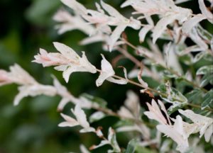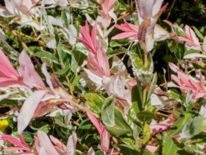Les feuilles du saule crevette sont rose saumon au printemps – d’où le nom de saule crevette – et deviennent blanches à vert tacheté en été. Ce sont en particulier les nouvelles pousses du saule crevette qui lui confèrent cet aspect si particulier.