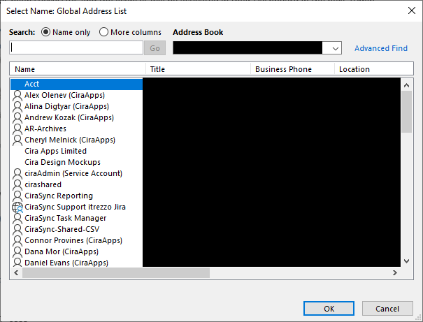 - Recherchez la boîte aux lettres partagée que vous souhaitez ouvrir. Dans cet exemple, la boîte aux lettres partagée est nommée CirashaShared.
