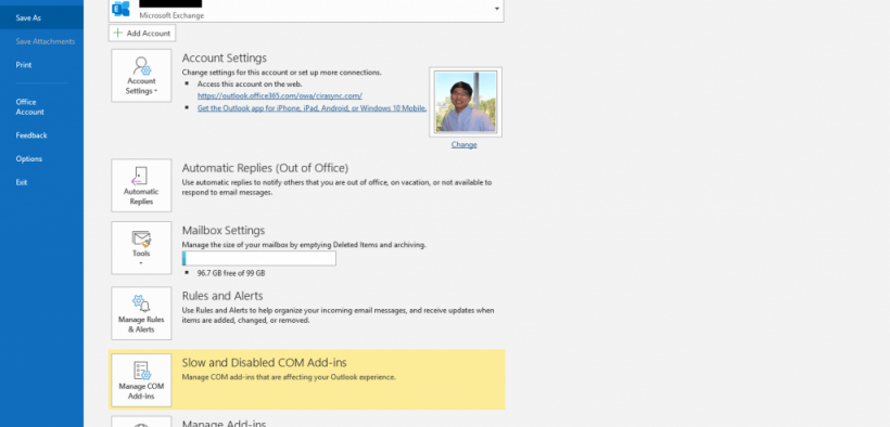 - Cliquez sur Fichier sur le ruban. Vous serez redirigé vers les options du menu Outlook. (Voir l’image ci-dessous.)