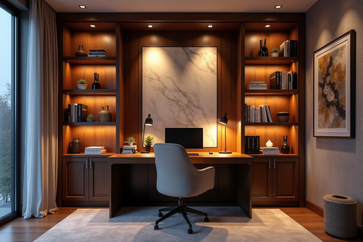 - Pièce de vie : bureau modulable ou d’angle, harmonieusement intégré à une bibliothèque murale.