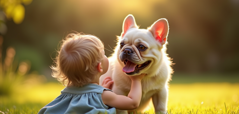 Bouledogue français jouant avec un enfant dans le jardin