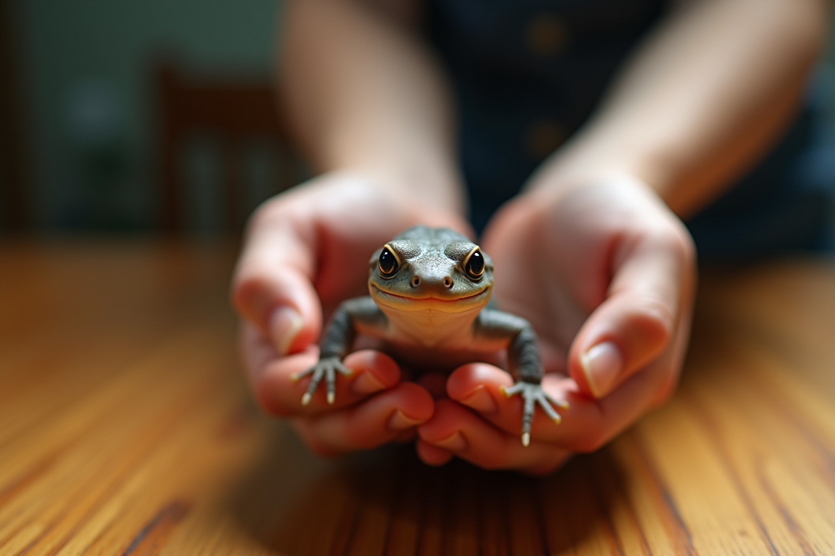 Personne tenant une salamandre sur une table en bois