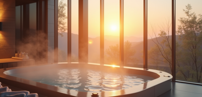 Vue du matin dans un spa privé avec jacuzzi et lumière naturelle