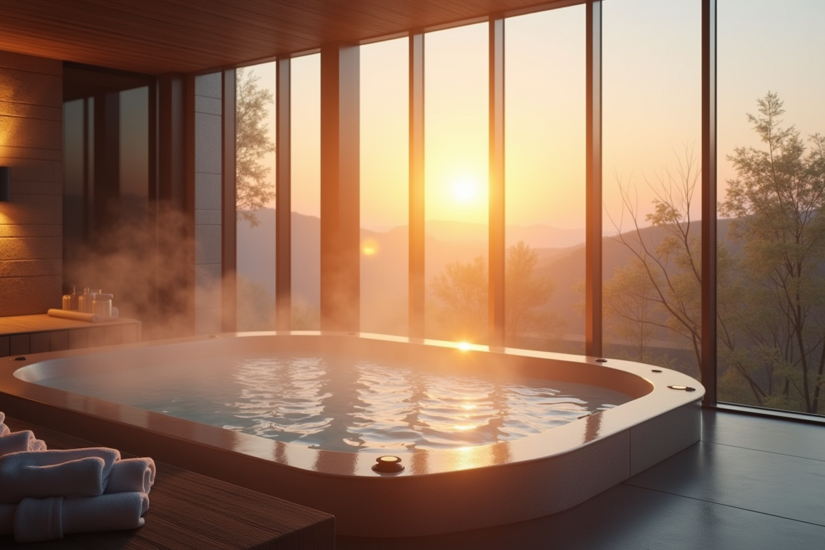 Vue du matin dans un spa privé avec jacuzzi et lumière naturelle