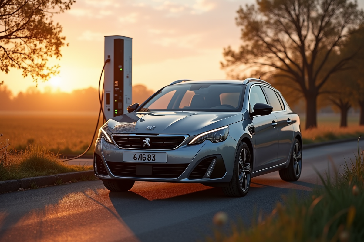 Peugeot 308 hybride en charge en campagne au coucher du soleil