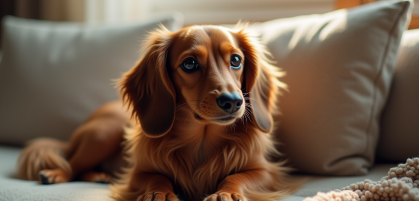 Teckel à poil long allongé sur un canapé chaud à l’intérieur
