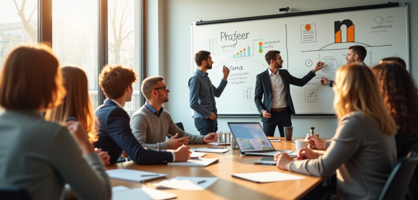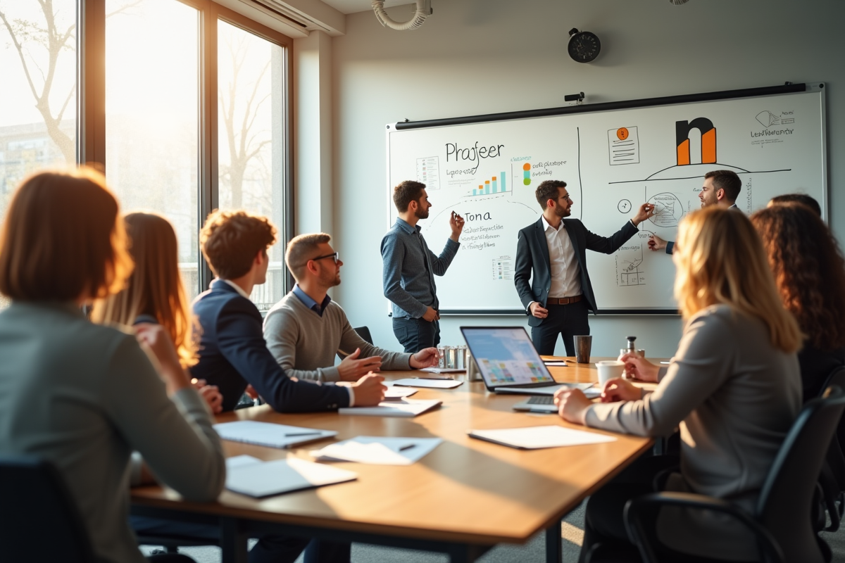 Groupe diversifié en brainstorming autour d un tableau blanc