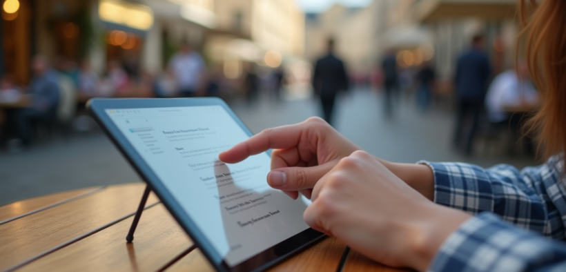 Mains gérant des emails sur tablette dans un café à Nantes
