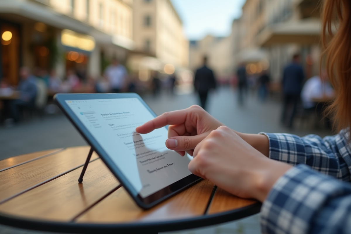 Mains gérant des emails sur tablette dans un café à Nantes