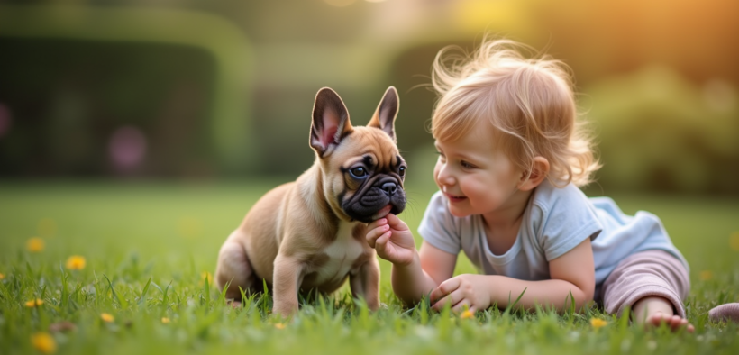- Race bouledogue français : très fidèle à ses proches, mais la vie au contact de jeunes enfants nécessite un œil attentif, jamais d’interaction sans la moindre surveillance.