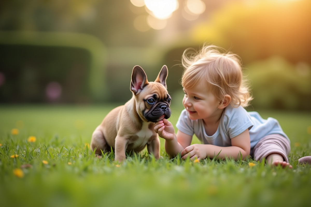 - Race bouledogue français : très fidèle à ses proches, mais la vie au contact de jeunes enfants nécessite un œil attentif, jamais d’interaction sans la moindre surveillance.