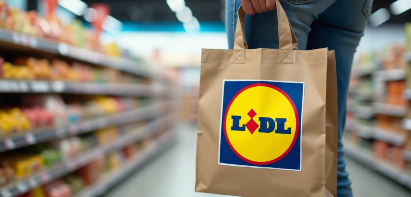 Personne tenant un sac Lidl dans un supermarche lumineux