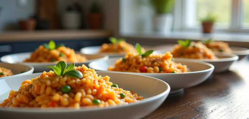 Cinq bols de risotto chorizo aux saveurs variées en cuisine lumineuse