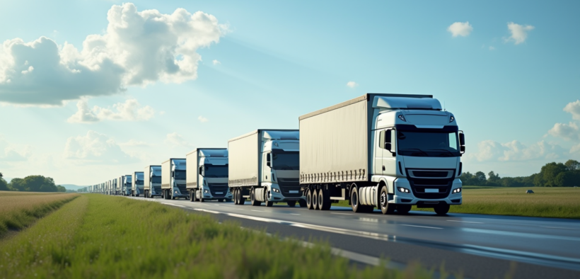 Convoi de camions de 26 tonnes sur une route en campagne en plein jour