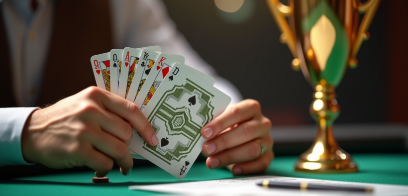 Mains tenant des cartes Kem avec un trophée sur la table