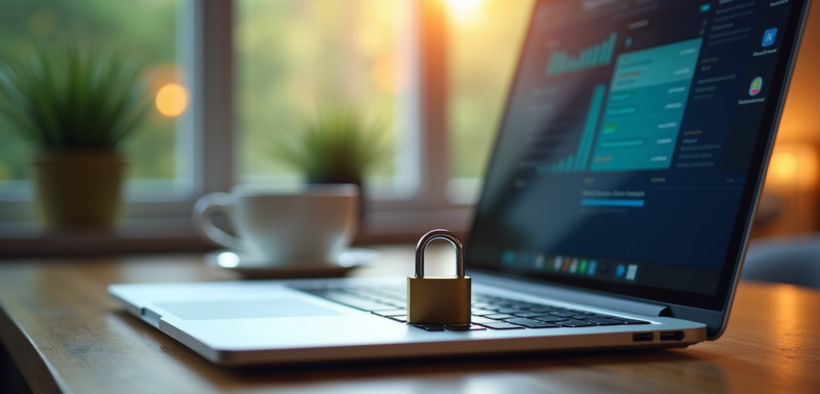 Espace de travail avec ordinateur et cadenas sur le clavier