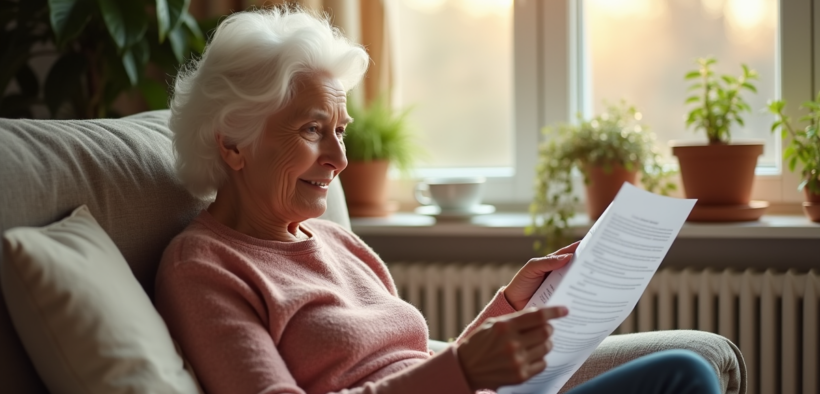 Femme agee lisant des documents de retraite chez elle