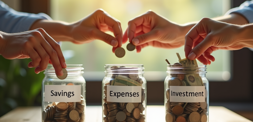 Mains plaçant des pièces et billets dans des jars