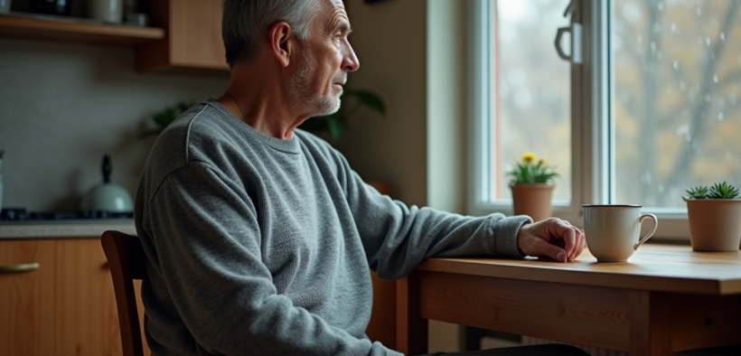 Homme contemplant par la fenetre dans une cuisine chaleureuse