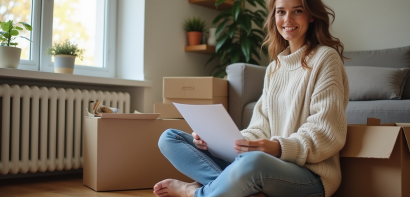 Jeune femme signant un contrat de prêt immobilier dans son appartement