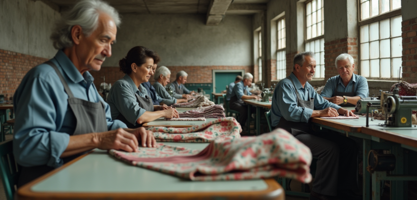 Travailleurs en atelier textile vintage assemblant des vêtements