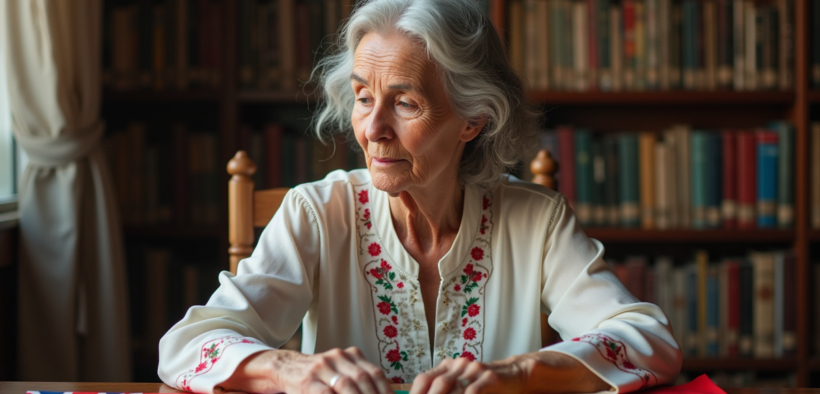 Femme âgée arrangeant des drapeaux dans une ambiance studieuse