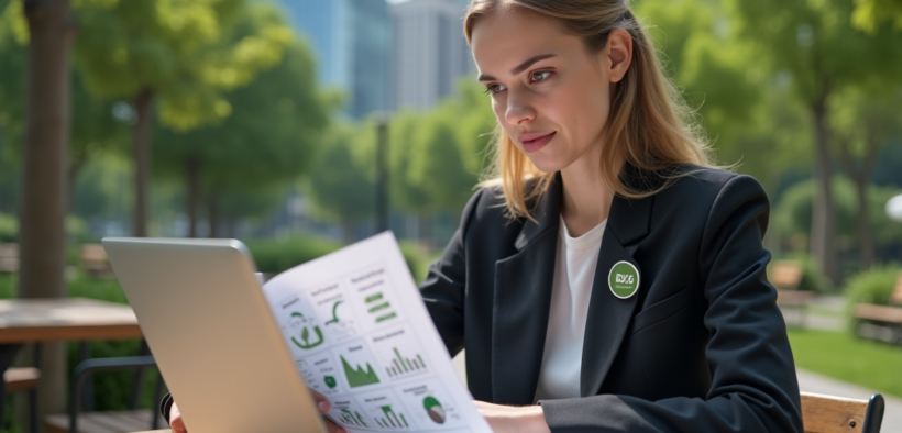 Jeune femme travaillant sur un rapport ESG en extérieur