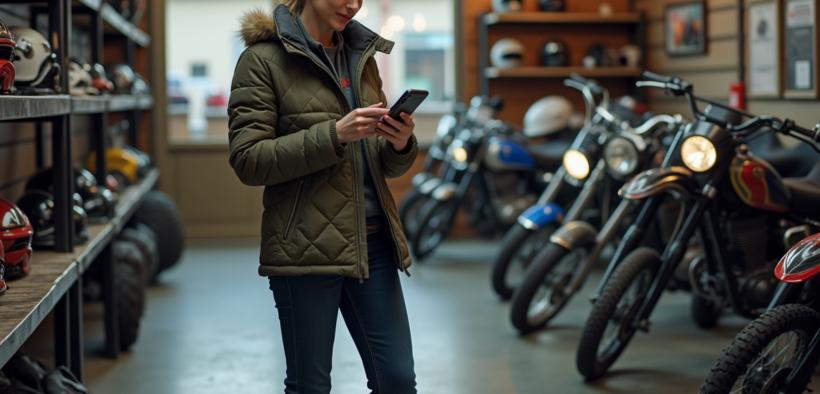 Femme vérifiant une annonce sur smartphone dans un magasin de motos