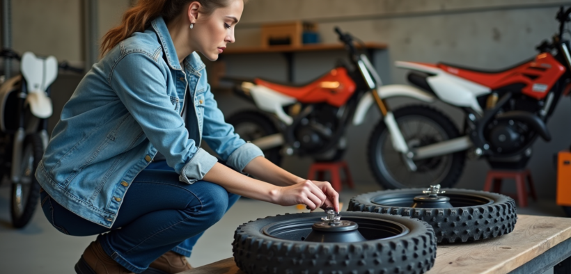 Femme dans un atelier compare deux roues de dirt bike sur un plan de travail