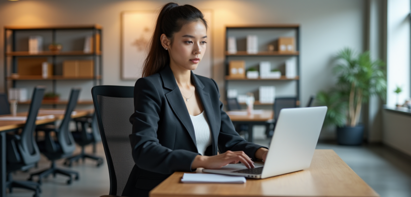 Jeune femme professionnelle travaillant sur un bureau ergonomique