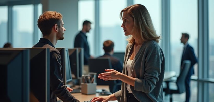 Femme montrant des commandes à une collègue dans un bureau lumineux