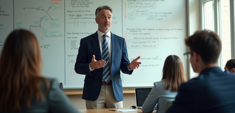 Professeur en costume enseignant la fiscalite devant un tableau blanc