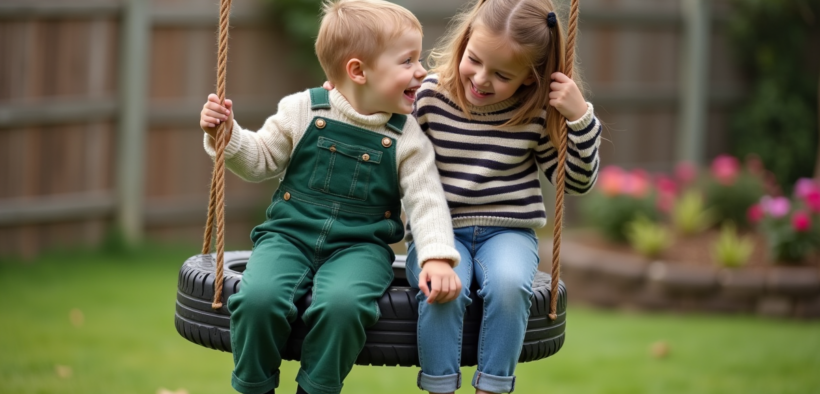 Deux enfants jouant sur une balançoire dans un jardin