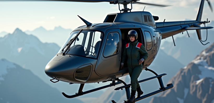 Hélicoptère en vol au-dessus de paysages alpins avec équipière