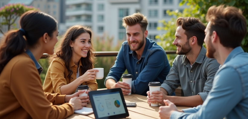 Groupe de jeunes professionnels discutant en extérieur écologique