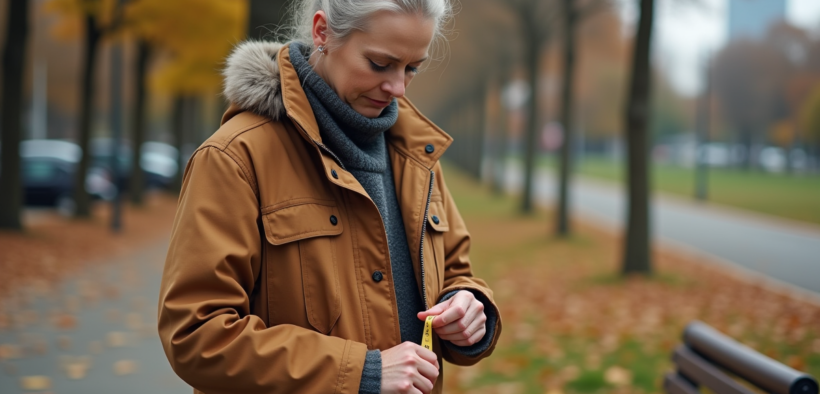 Femme mesurant une veste en extérieur en automne