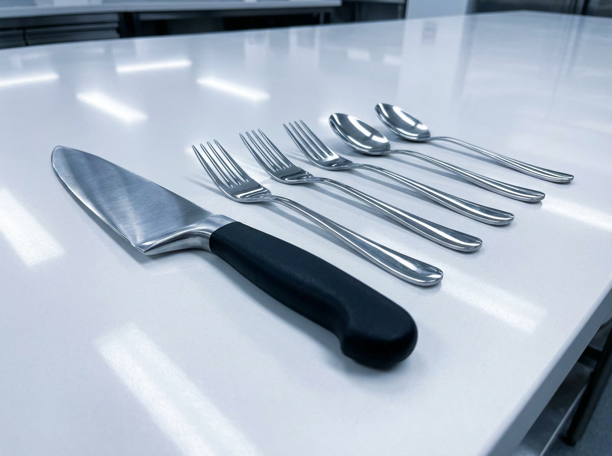 Face à ce niveau d’exigence, le couteau industriel joue une autre partition. La production en série impose l’uniformité, l’optimisation des coûts, la recherche de fiabilité. Acier inoxydable, manches en plastique, finitions régulières : tout est pensé pour la reproductibilité. L’humain s’efface derrière les machines et l’objet, devenu produit, perd sa dimension unique. Sur la chaîne, chaque exemplaire ressemble à l’autre, sans surprise ni histoire.