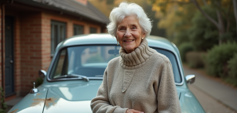 Femme âgée souriante près de sa voiture vintage dans la rue