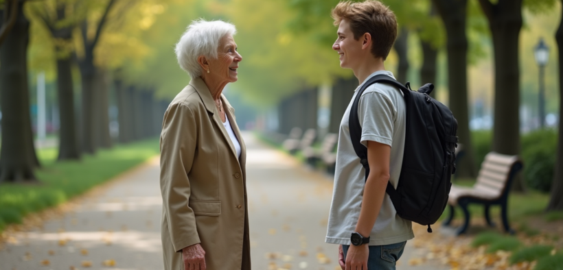 Grand-mère et adolescent discutant dans un parc urbain