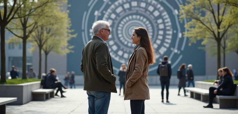 Homme et femme discutant devant une installation artistique urbaine